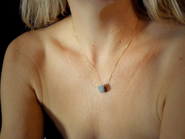 Akvamarin betyder “vandet af havet” og er kendt som havfruens og sejlerens sten. Den bringer mod til den der bærer den samtidig med, at den øger tolerancen overfor mennesker omkring sig. Akvamarin er særlig god til sensitive mennesker idet den beroliger og minimerer frygt. Lider du af stress, er akvamarin god til at hjælpe dig med at finde ro og har du et vigtigt møde, en jobsamtale eller lignende, hvor du skal præstere mundtligt, hjælper akvamarin dig med at tale klart. Akvamarin vedhænget er sat på en kæde, lavet i genanvendte materialer. Ønsker du sølv er den i sterling sølv - ønsker du den i guld er den sat på en guld dublé kæde (læs mere nederst). Den smukke beryl har så mange fine egenskaber: